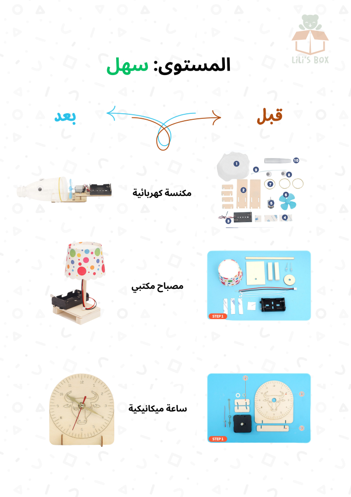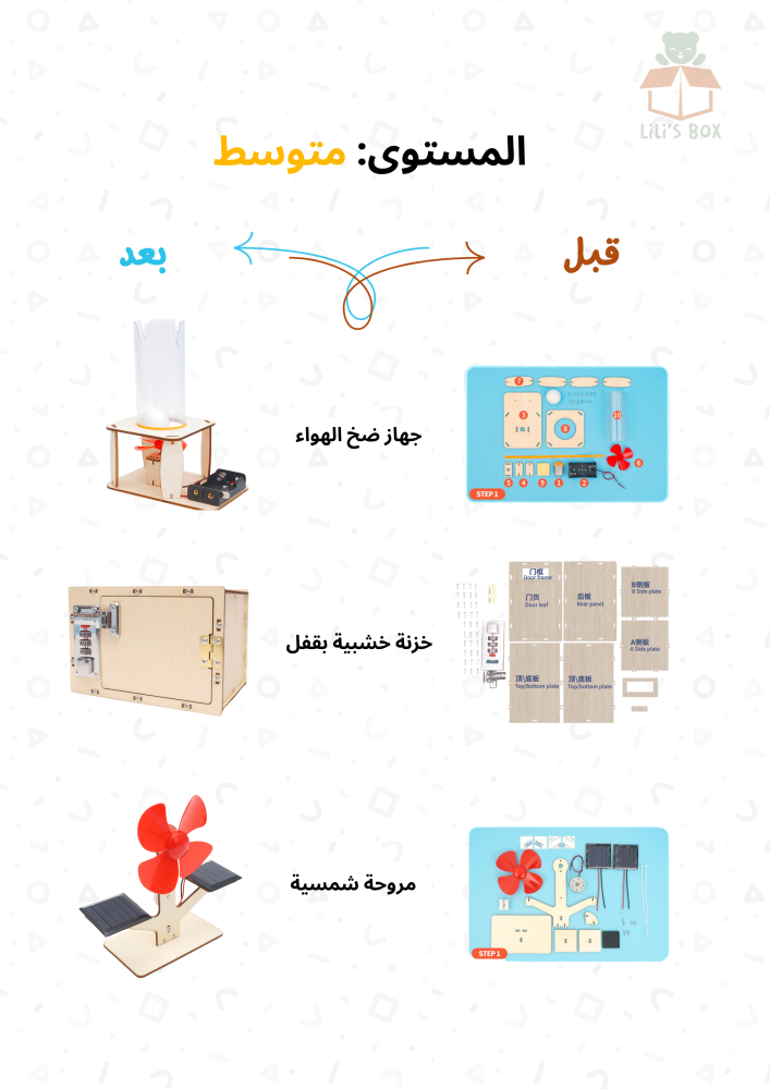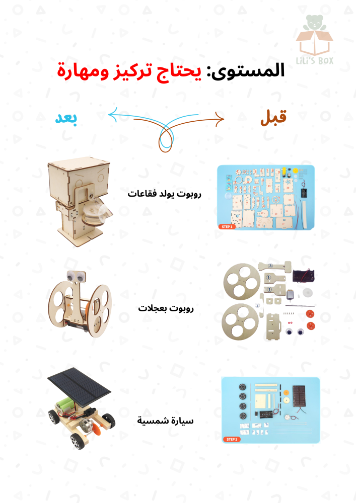 لأن كل مشروع في هذا الصندوق ما هو مجرد لعبة… هو أداة تعليمية تعزز ذكاء طفلك وتفتح له أبواب الفهم والتطبيق العلمي من البيت، بدل ما يضيع وقته على ألعاب إلكترونية، خله يصنع، يكتشف، ويفهم بنفسه كيف تشتغل الأشياء حوله.