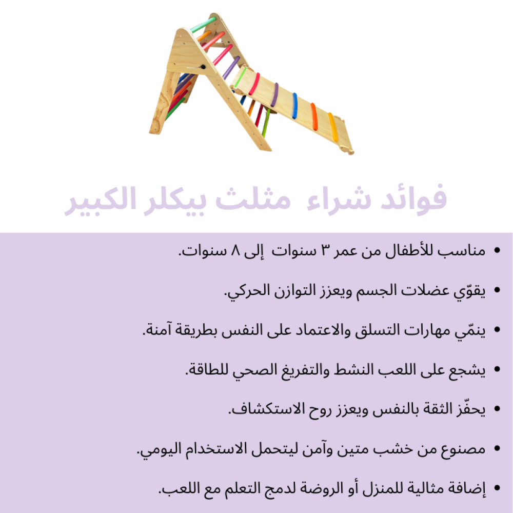 مثلث بيكلر هو أداة تعليمية مبتكرة تهدف إلى تعزيز نمو الأطفال الحركي والعقلي من خلال تصميمه الخشبي الآمن يساعد الأطفال على تحسين توازنهم وقوة عضلاتهم عبر التسلق واللعب الحر بالإضافة إلى ذلك، يعزز استقلاليتهم وتقديرهم لذاتهم مما يساهم في تطوير مهاراتهم.